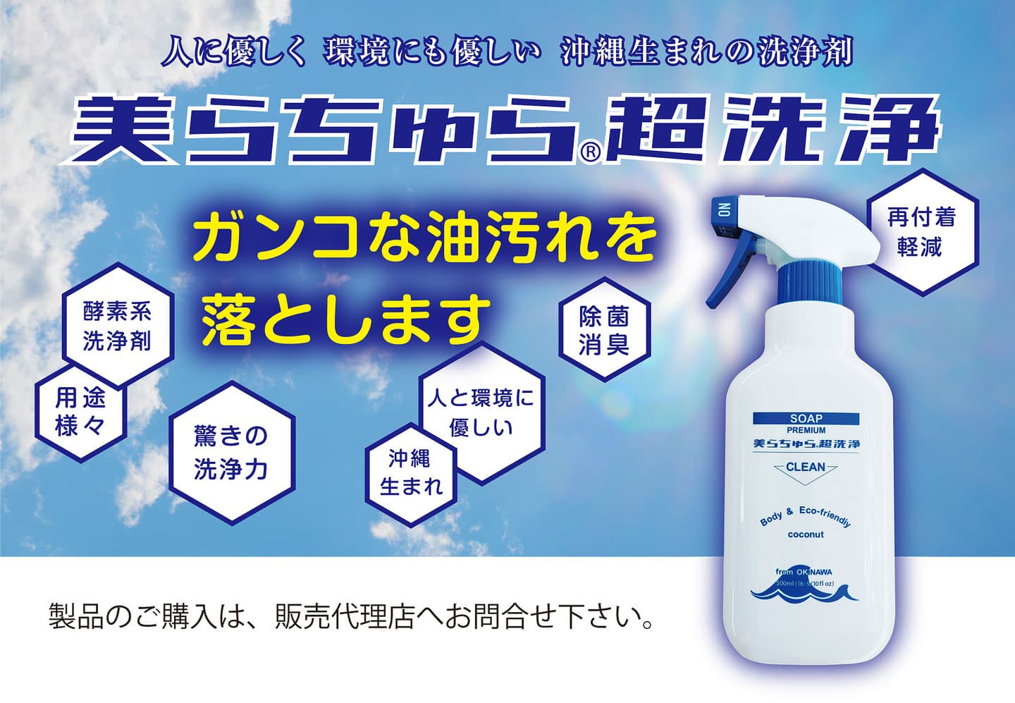 美らちゅら超洗浄は弱アルカリ性の酵素(天然由来)が肌を守り、油を乳化させずに分解するため環境への負担も低減します。