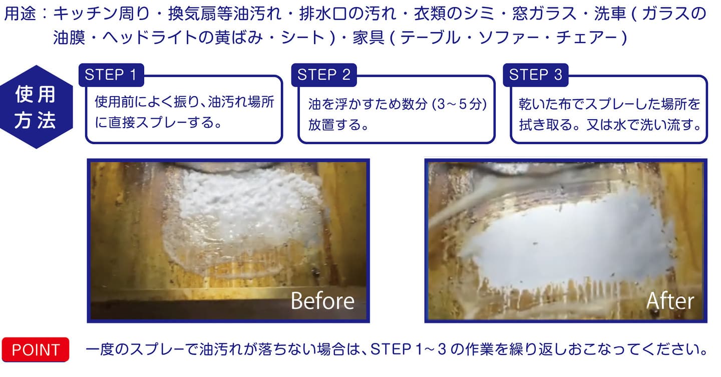 キッチン周り・換気扇等油汚れ・排水口の汚れ・衣類のシミ・窓ガラス・洗車( ガラスの油膜・ヘッドライトの黄ばみ・シート)・家具( テーブル・ソファー・チェアー)など