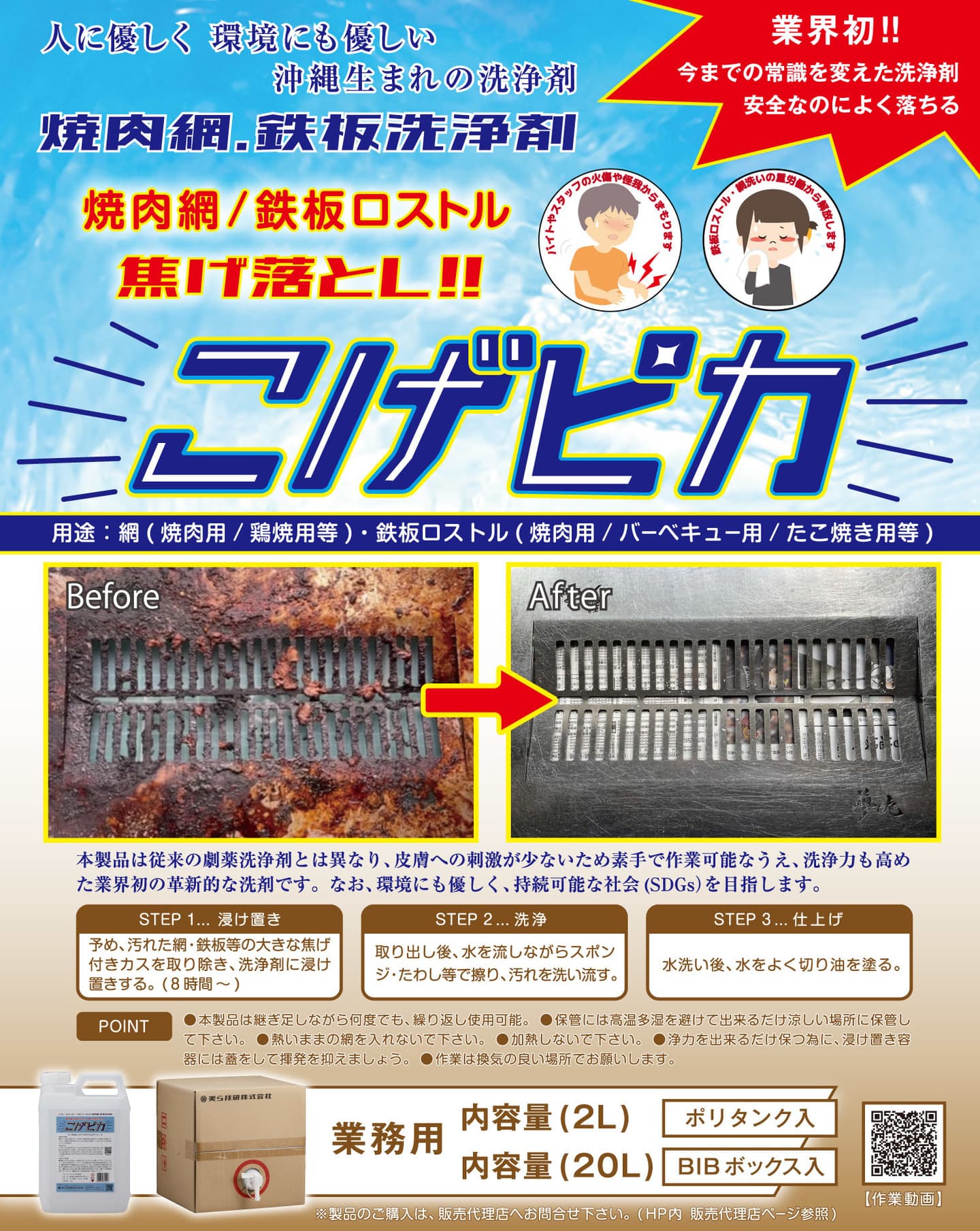 強固なコゲを安全に徹底的に落とす。 劇薬成分を含まないこげピカは、人体にも優しいため作業しやしく、効果も強力。8時間程度の浸け置きで、驚くほど簡単にガンコなコゲを落とします。 使用方法 ■ 薄めずそのままご使用ください。あらかじめ用意した桶などにこげピカを入れ、大きなコゲを取り除いた対象の網・鉄板を漬け込みます。8時間ほどしたらタワシ・スポンジなどで擦り、汚れを洗い流します。後は通常通り、油を塗りご使用いただけます。 下記記載用途でご使用ください 【主な使用場所例】網(焼肉/鶏肉等)・鉄板ロストル(焼肉用/バーベキュー用/たこ焼き用等) ご購入は…